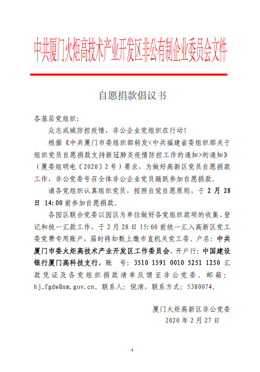 近日,為響應上級黨組織自愿捐款的倡議,創業園聯合黨委號召下轄各非公黨組織積極發動黨員開展了第二批抗擊疫情愛心捐款活動。乾照黨總支在總支部書記牛興盛同志的組織下,為支持新冠肺炎疫情防控工作開展了積極有序的捐款行動,一天的時間,黨員干部及入黨積極分子們已籌集款項5338元。