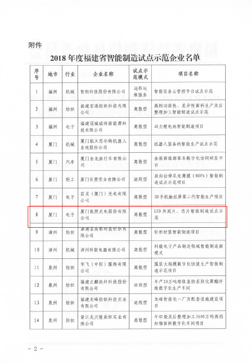2018年,乾照光電在紅黃光領域,堅持“擴產+擴充高端產品”的發展戰略;在藍綠光領域,實施“全面擴產,規模跟隨”的布局戰略,爭取做行業龍頭。通過自身努力獲得了行業的廣泛認可。2018年,乾照光電的LED外延片及芯片智能制造項目更是榮獲國家工信部智能制造試點示范項目、福建省經信委智能制造試點示范項目、廈門市智能制造樣板工廠(車間)示范等一系列榮譽。