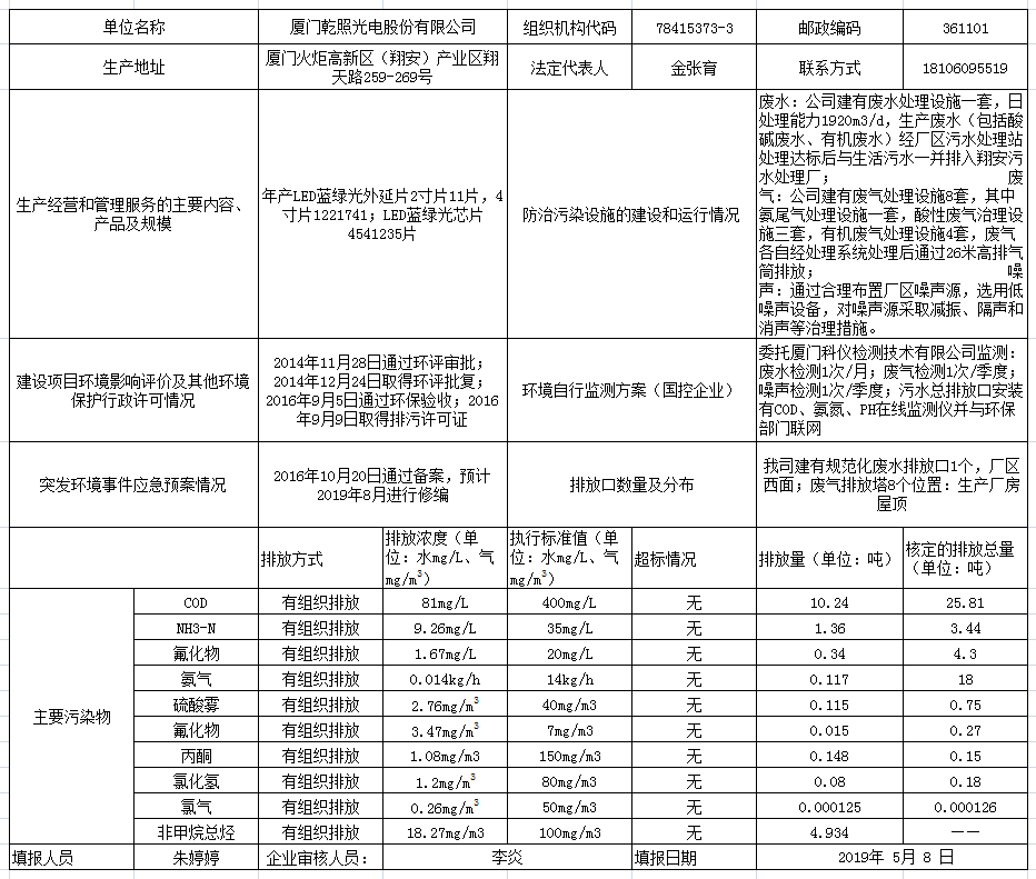 廈門乾照光電股份有限公司環境信息表