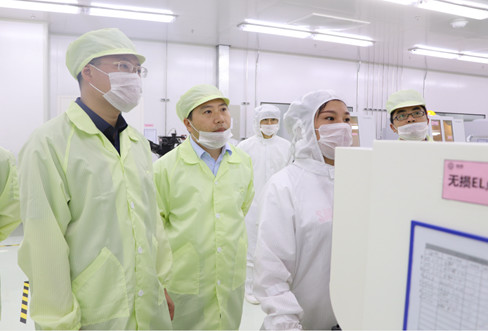 隨后,考察組一行參觀了生產車間,重點觀摩了芯片工藝流程和點測工藝,對現代化的生產技術頻頻稱贊。得知外延生產車間中運作良好的MOCVD設備均為南昌當地企業生產制造時,盛煒書記對乾照光電對南昌光電產業發展的支持表示了贊許。
