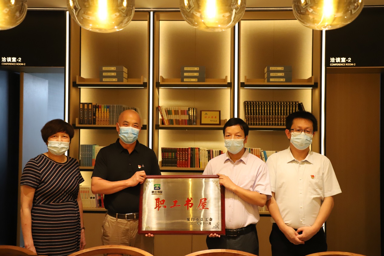 2020年5月26日,黨建掛鉤聯(lián)系單位廈門市總工會副主席劉義平一行蒞臨乾照光電調(diào)研指導(dǎo),翔安區(qū)總工會常務(wù)副主席王黎明等領(lǐng)導(dǎo)陪同調(diào)研。調(diào)研組一行參觀了公司展廳、書吧以及黨建文化墻、黨群活動中心,詳細(xì)了解了公司生產(chǎn)、經(jīng)營以及黨建帶工建工作情況。期間,雙方還舉行了“職工書屋”授牌儀式。