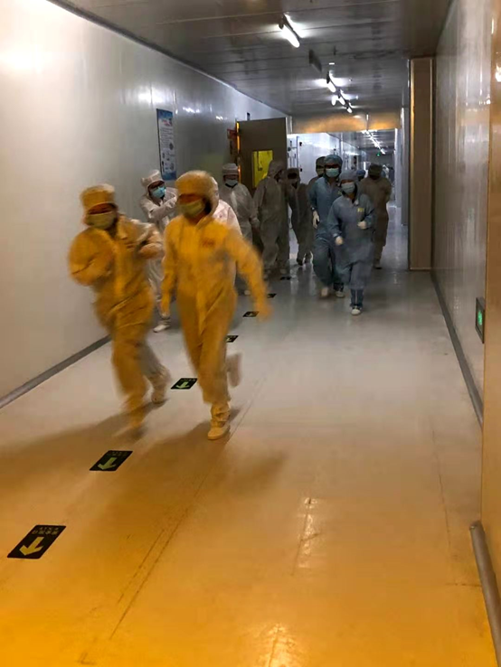 本次演練以16:19蒸鍍車間發生火災為假想場景,由初期自行應急處置和啟動應急響應機制兩部分組成。整個演練過程緊緊圍繞發現火情、預警及響應、應急處置、指揮協調、人員疏散、集合清點、接觸警報等重點環節展開。16:21應急疏散演練指揮部下達撤離命令,要求全體人員在疏散引導員組織下沿安全疏散通道快速撤離。16:24全體人員到達緊急疏散集合地點,合計耗時5分14秒。本次演練全程協調有序、示范性強,情景逼真。