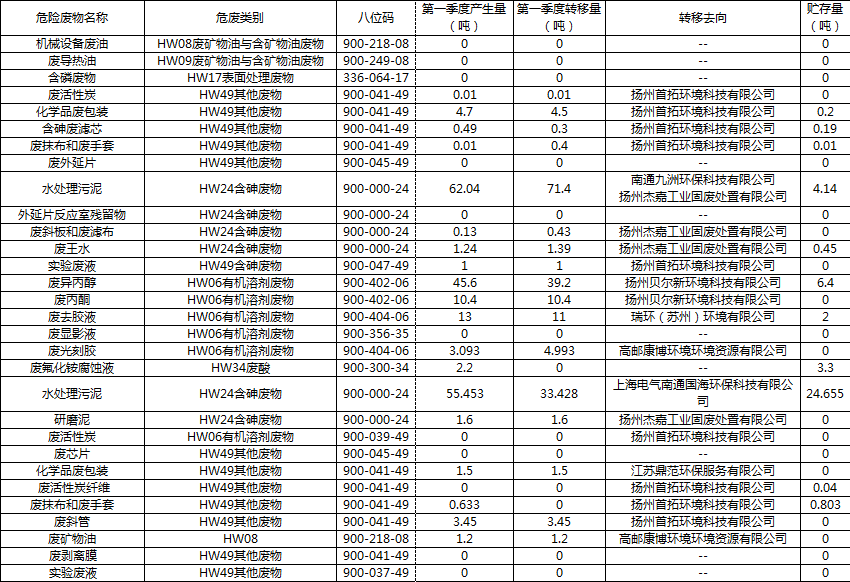 2022年第一季度危廢產生、轉移、貯存情況公示