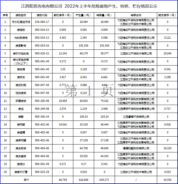 江西乾照光電有限公司2022年上半年危險(xiǎn)廢物產(chǎn)生、轉(zhuǎn)移、貯存情況公示