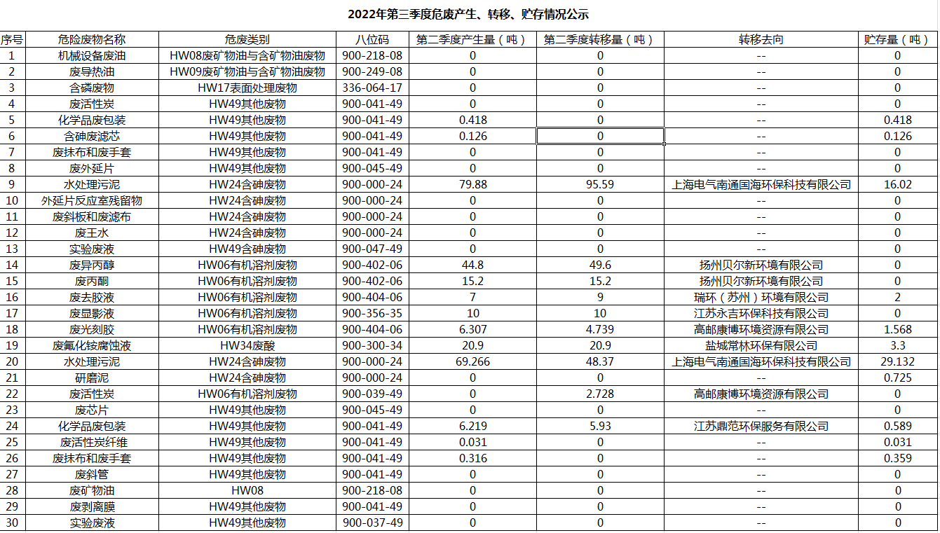 揚州乾照光電有限公司2022年第三季度危廢產(chǎn)生、轉(zhuǎn)移、貯存情況公示