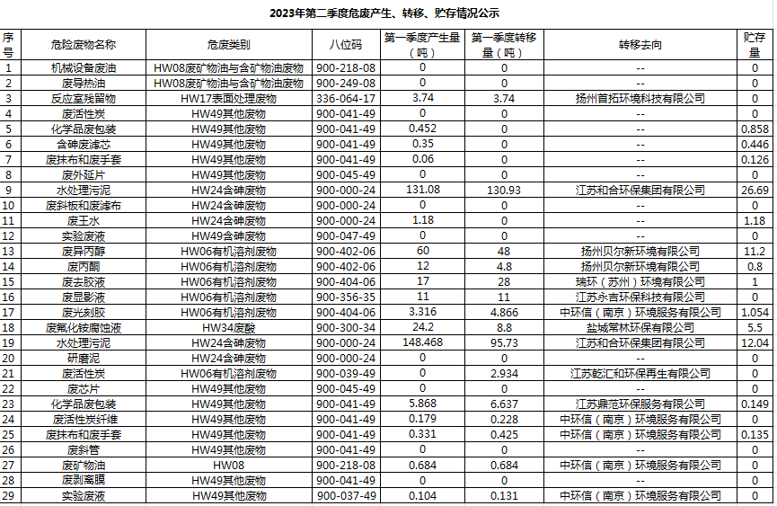 揚州乾照光電有限公司2023年第二季度危廢產生、轉移、貯存情況公示