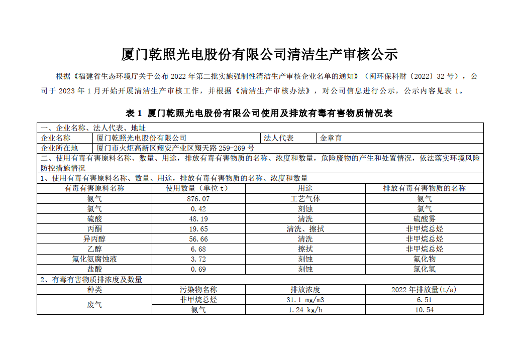 廈門(mén)乾照光電股份有限公司清潔生產(chǎn)審核公示