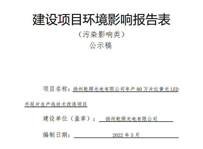 揚州乾照光電有限公司年產80萬片紅黃光LED外延片生產線技術改造項目環境影響報告表公示稿