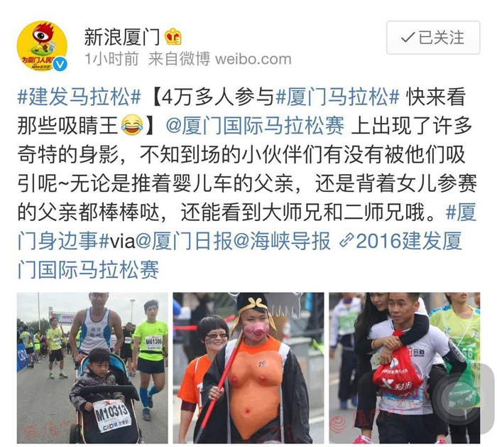 當然,這也離不開所有參賽選手們的齊心協助與辛苦付出。在賽道上,他們獨樹一幟,彰顯個性。在蕓蕓人海中,賺足了大眾的眼球。二師兄還上了當日新浪廈門官方微博頭條呢。師徒仨及我司的吉祥物也被廈門網、廈門晚報等媒體報道啦。這不僅僅展示了參賽者的活力,更彰顯了我司的品牌魅力。