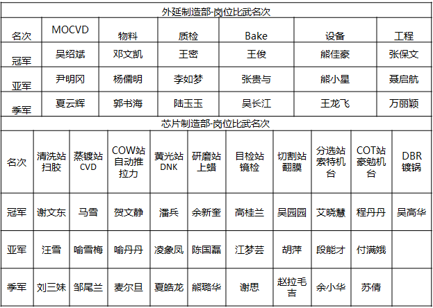 外延崗前比武項目涉及機臺組取放片、質檢組鐳刻+測試、物料組發料PVD操作、Bake組烤爐、工程組硬件、控制率,設備組球閥、過濾器清理等項目。芯片技能比賽項目包括清洗站掃膠、蒸鍍站CVD、COW站自動推拉力、黃光站DNK、研磨站上蠟、目檢站鏡檢、切割站翻膜、分選站索特機臺、COT站豪勉機臺、DBR鍍鍋等。經過多輪比拼,最終46位選手脫穎而出,榮獲各項冠亞季軍。