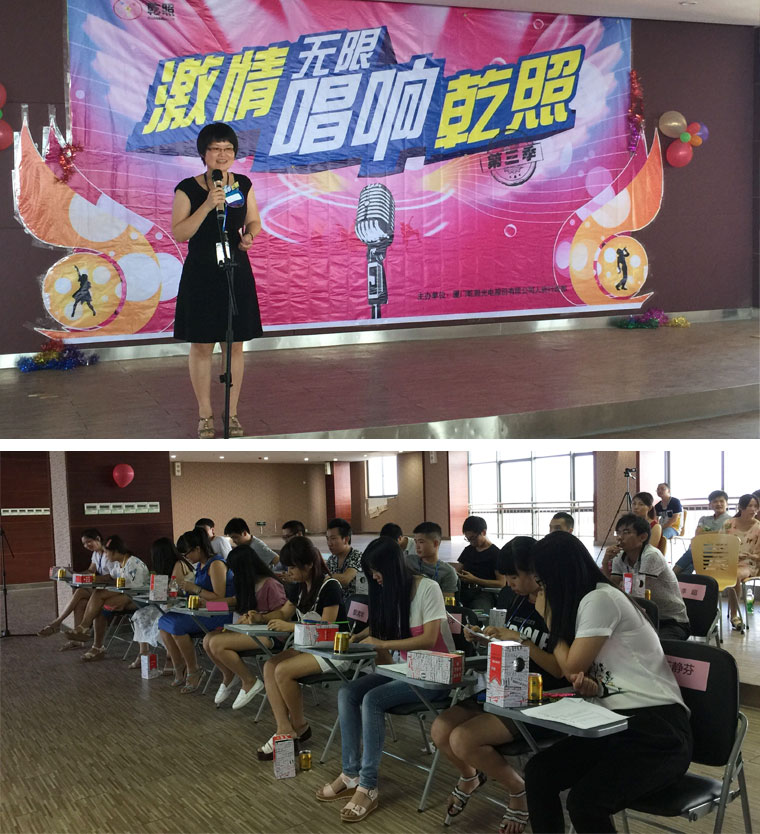 該比賽在辦公樓8樓大禮堂舉行,雖然沒有專業(yè)的場地,但負(fù)責(zé)此次活動的組委會成員各揚己長,設(shè)計海報,宣傳報名、布置場地,選拔主持人、拉贊助等,實現(xiàn)了小制作,大實現(xiàn)的效果。組委會還給選手評委準(zhǔn)備貼心小禮物,讓大家由衷地感受到他們的用心。本次比賽不僅是為大家提供展示歌唱風(fēng)采的舞臺,更讓大家感受到了乾照這個大家庭的溫馨,推動了我司員工精神文明的建設(shè)。讓我們期待下一季的歌唱比賽吧!