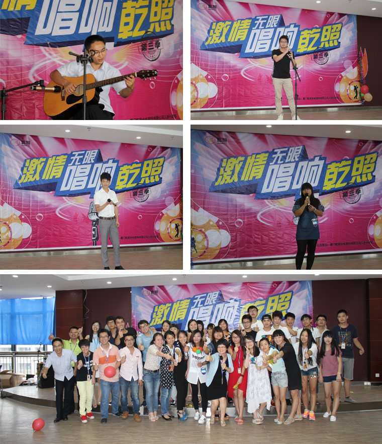 本季歌唱比賽旨在為公司尾牙活動選拔才藝類節(jié)目,發(fā)揮發(fā)掘大家文藝方面的才能,同時通過對企業(yè)文化的發(fā)揚達(dá)到促進(jìn)對員工的影響,開拓創(chuàng)新思維。各位參賽選手準(zhǔn)備充分,發(fā)揮最優(yōu)水準(zhǔn)。各位大眾評委通場與歌手互動,比賽現(xiàn)場始終洋溢著隆重?zé)崃业臍夥铡R皇子赏庋又圃觳吭O(shè)備組洪輝柏的獨唱《你是我的眼》,拉開了比賽的序幕。整場比賽歌聲悠揚,現(xiàn)場氣氛火爆,洋溢著濃郁的節(jié)日氣氛。兩首不同風(fēng)格的《海闊天空》在外延部戴金途和采購部陳明郅的演繹下,把比賽推向高潮。現(xiàn)場吸引了各個部門領(lǐng)導(dǎo)、員工前來觀戰(zhàn),并不時贏得陣陣掌聲和歡呼聲。在經(jīng)過緊張激烈的評選后,最終有11名選手進(jìn)入復(fù)賽。在8月27號下午,決賽終于開始了。選手們雖然心情更加緊張,但一上臺就盡情歌唱,臺下的評委也給出了公正公平的分?jǐn)?shù)。本次比賽也秉承著“友誼第一,比賽第二!”的宗旨,有的選手雖然沒獲獎,但他們非常享受這個舞臺。最終,芯片部的陳健文演唱的一首《小情歌》虜獲了所有評委的心,獲得冠軍,外延部的戴金途取得亞軍,研發(fā)部的姜偉取得季軍的好成績。