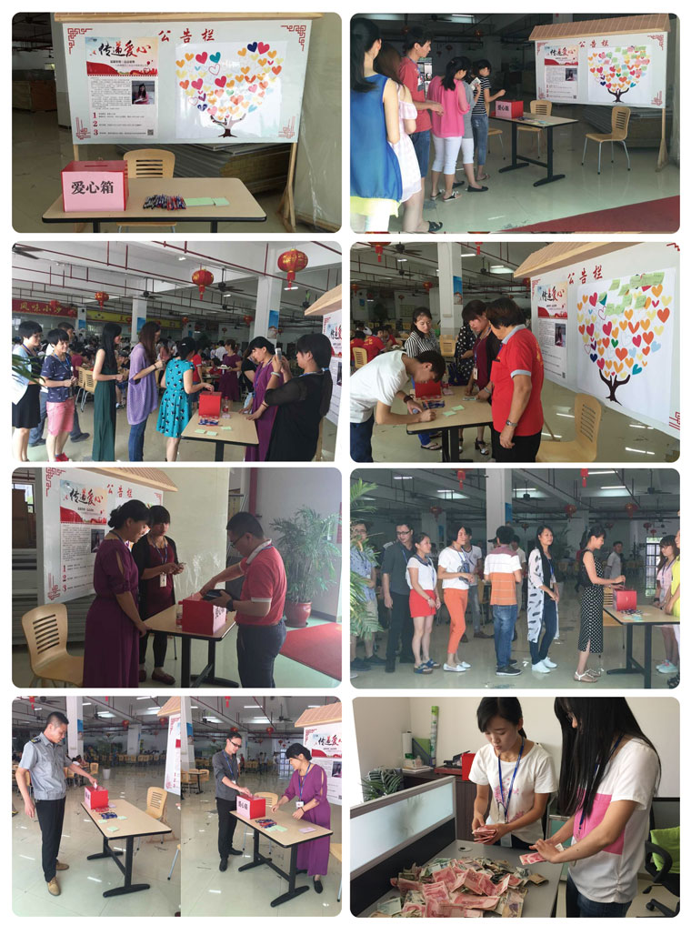 在得知侯劉寶華罹患胃癌的消息后,公司領導高度重視,第一時間前往醫院探望慰問,帶去了大家的問候和公司的慰問金。隨后,人資行政部向全公司發出募捐倡議書,開通三個愛心通道(現場募捐、銀行轉賬、微信轉賬)。所有乾照人,包括駐廠工作的合作廠商紛紛慷慨解囊,捐款相助,傳遞著愛與正能量。很多同事還在愛心墻上寫滿祝福語,希望劉寶華能早日康復。截至到8月底,據人資行政部的不完全統計,已累計向寶華提供愛心捐款50924元。還有很多員工把捐款通過銀行轉賬和微信支付打入劉寶華本人。